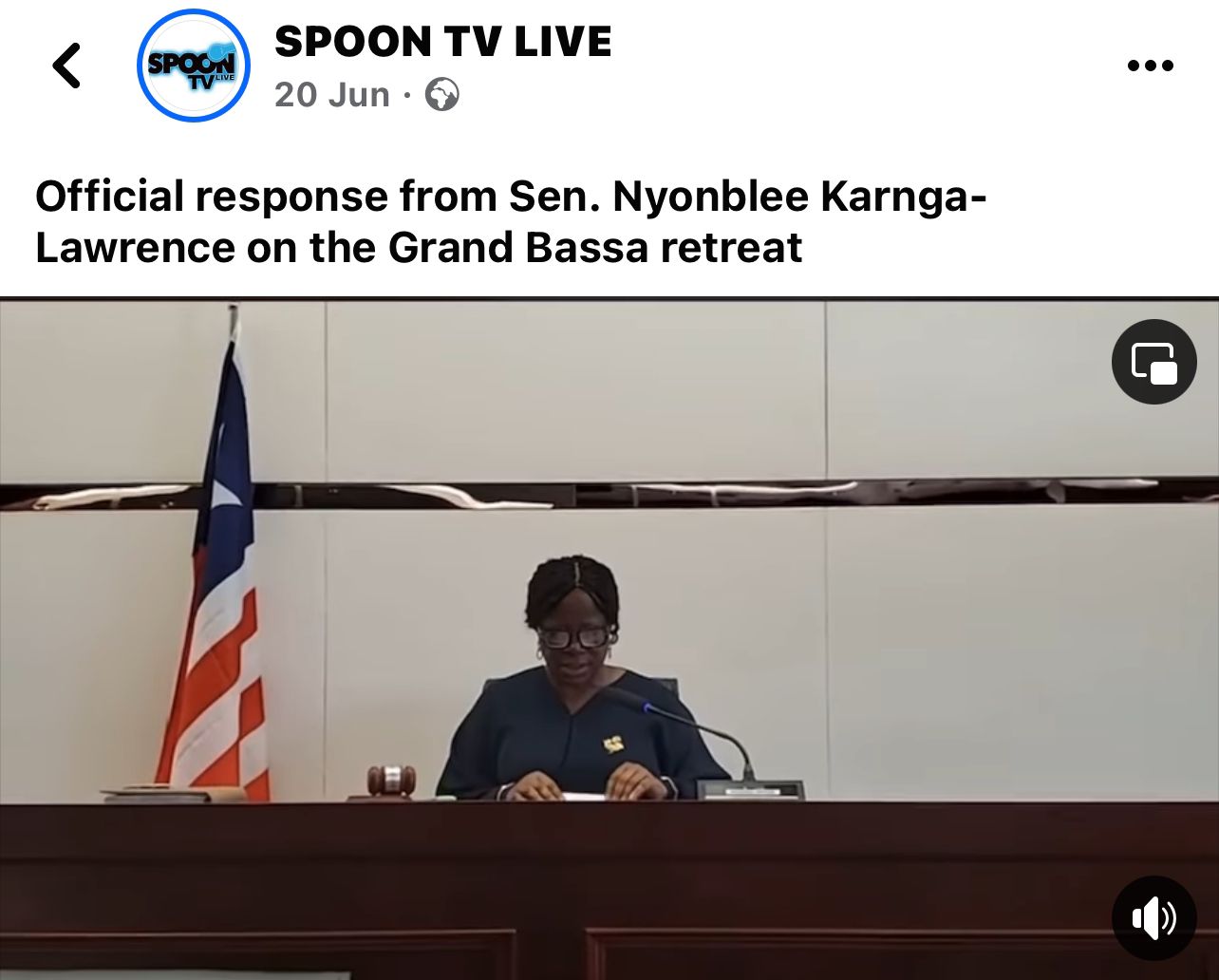 Senator Karnga-Lawrence, in a video posted by Spoon TV titled: “Official response from Sen. Nyonblee Karnga-Lawrence on the Grand Bassa retreat” was reacting to the many allegations surrounding the Senate’s retreat in Buchanan, Grand Bassa County.