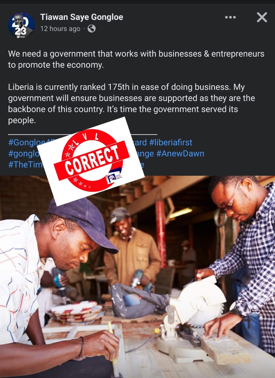 Wrote Cllr. Gongloe on May 11: “We need a government that works with businesses & entrepreneurs to promote the economy.​ Liberia is currently ranked 175th in ease of doing business. My government will ensure businesses are supported as they are the backbone of this country. It’s time the government served its people.”