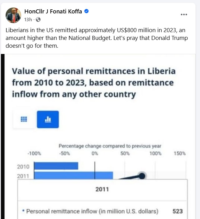 - Embattled House Speaker Fonati Koffa in a Facebook post claimed that Liberians in the United States remitted about US$800 million to Liberia in 2023