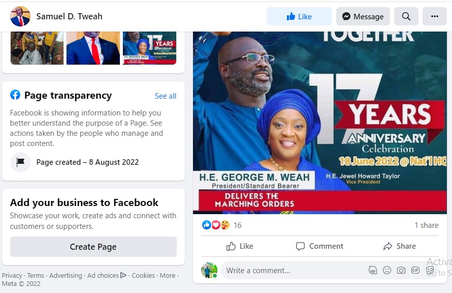 One is profile while the other is a page. The profile has garnered over 5,400 followers while the page has 750 likes. Both accounts have a photo of President Weah as profile photo. The Transparency for the page shows that it was created on August 8, 2022, while the profile was created on May 10, 2021.
