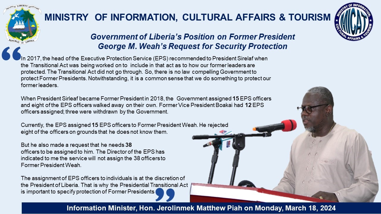 On Monday, March 18, Liberia’s Information Minister Jerolinmek Matthew Piah, claimed in a post on the official Facebook page of the Ministry of Information Cultural Affairs & Tourism that no law compels the government to protect former Presidents.