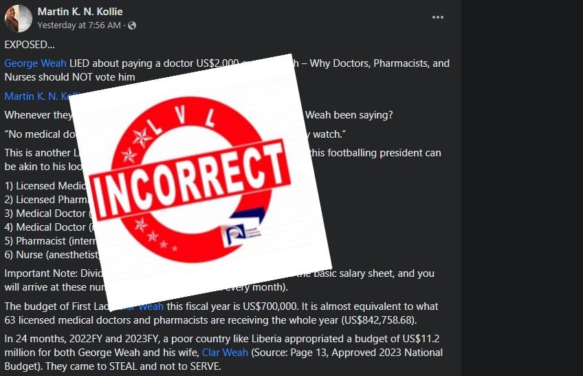 Kollie made the claim as an argument that money allotted to pay the salaries of medical doctors were lower than what was jointly allotted to the Office of the President and his wife. We have fact checked these two claims by Mr. Kollie, and here’s what we found: