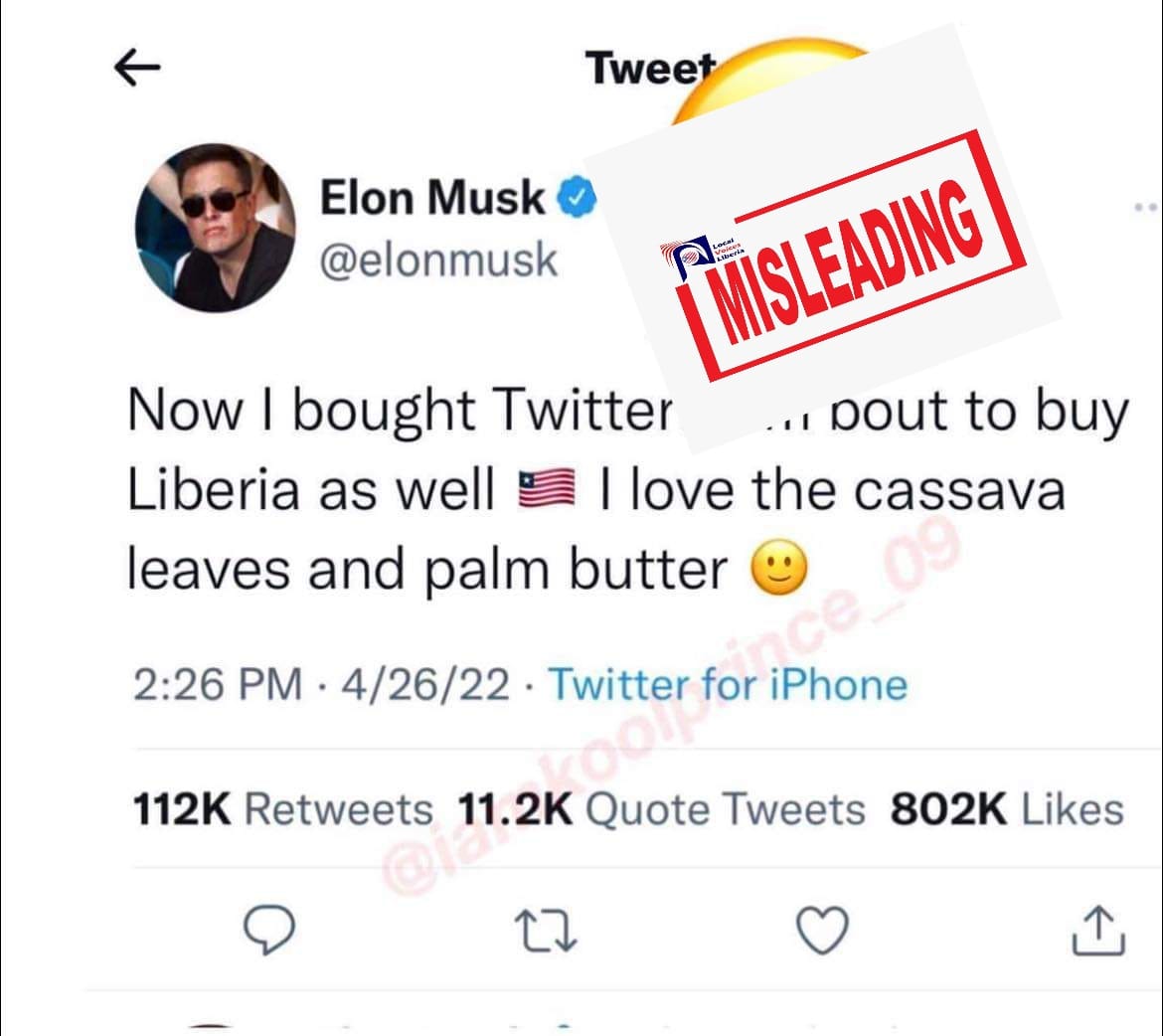 Monrovia – A screenshot of a purported tweet claiming to have been made by the world’s richest man Elon Musk is being spread on Facebook in Liberia. It claims that Mr. Musk is “bout to buy Liberia”. The tweet surfaced following his purchase of Twitter on April 25, 2022.