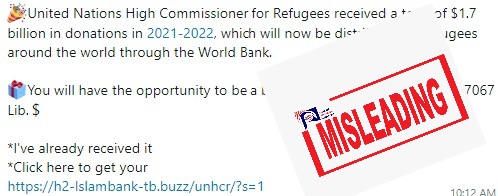 The link, which is mainly being shared via WhatsApp, states that “United Nations High Commissioner for Refugees received a total of $1.7 billion in donations in 2021-2022, which will now be distributed to refugees around the world through the World Bank.”