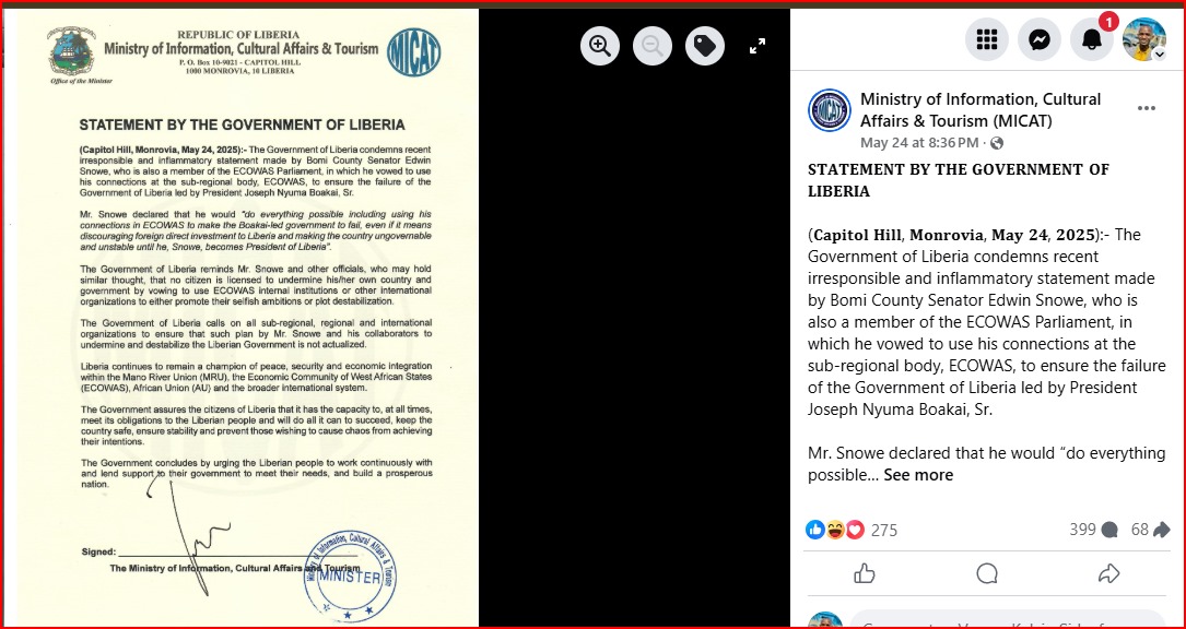 On May 24, the Government of Liberia issued a statement through the Ministry of Information condemning what it termed as “irresponsible and inflammatory statements” made by Bomi County Senator Edwon Melvin Snowe, Jr.