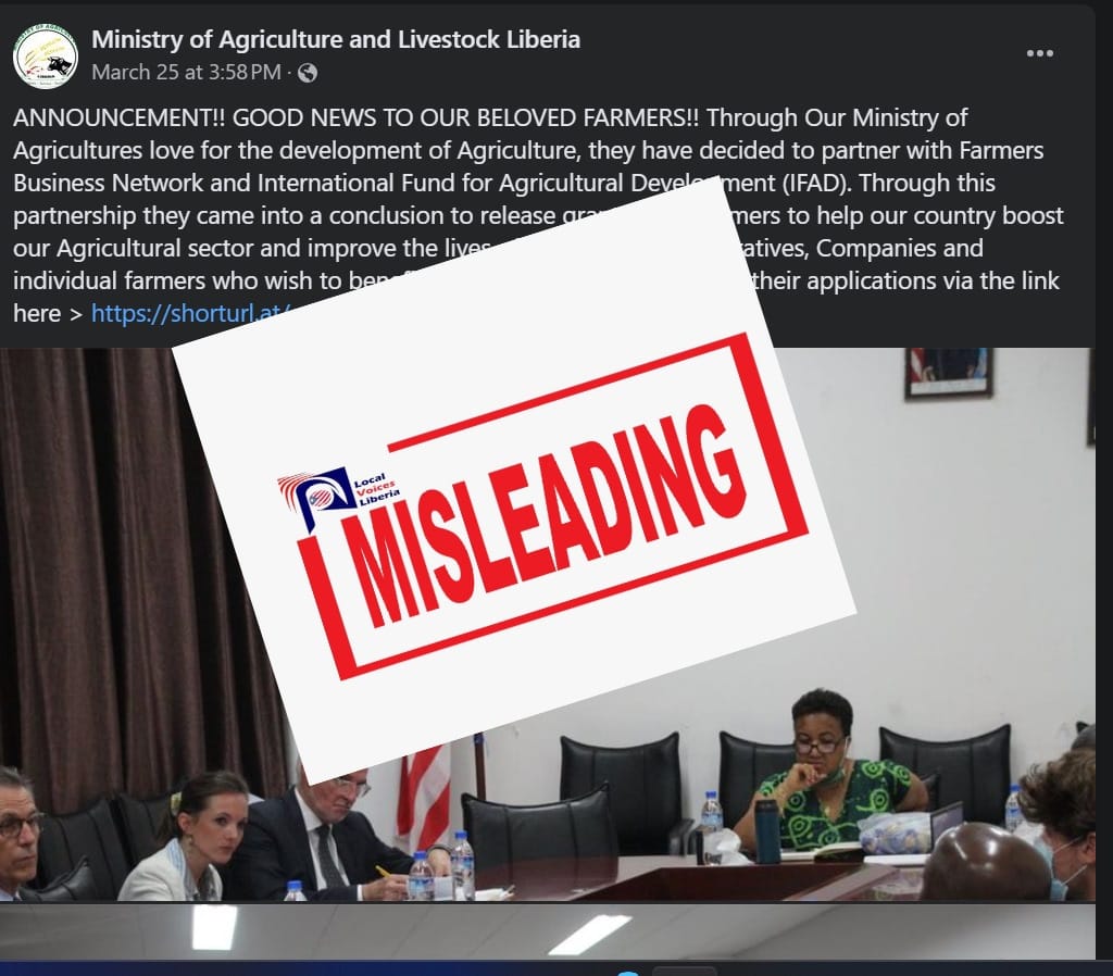 On March 25, a Facebook page “Ministry of Agriculture and Livestock Liberia” with the same profile photo as the official Facebook page of the Ministry of Agriculture made a post about grant opportunities for farmers.