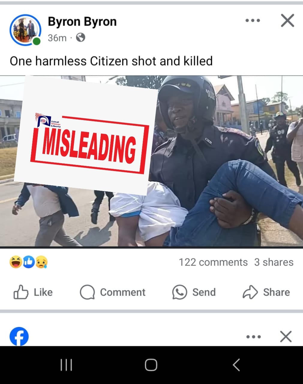 Meanwhile, Byron Brown, who is the Media Supervisor for the office of embattled House Speaker Fonati Koffa, also posted an image of a woman being carried by an officer of the Liberia National Police. He accompanied the photos with a claim that the woman was killed by the police.