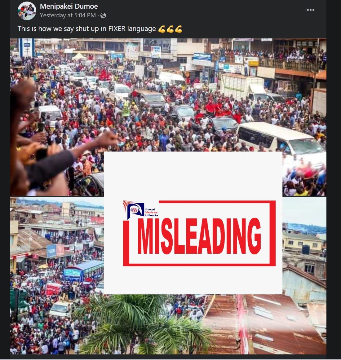 Based on these facts, we therefore conclude that the images shared by Bility and Dumoe are not images from the rally at ATS. They are photos taken on September 5, 2023 from a crowd that welcomed Uganda politician Bobi Wine in a Uganda town of Iganga and not the CPP rally of October 1, 2023 at the ATS. The posts are misleading.