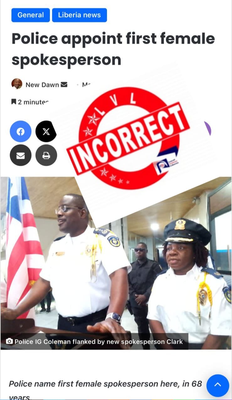 Summary: Social media posts claim that the newly appointed spokesperson of the Liberia National Police, Madam Cecelia Clarke, is the first female to be appointed to that position. We checked this claim and found it to be incorrect.