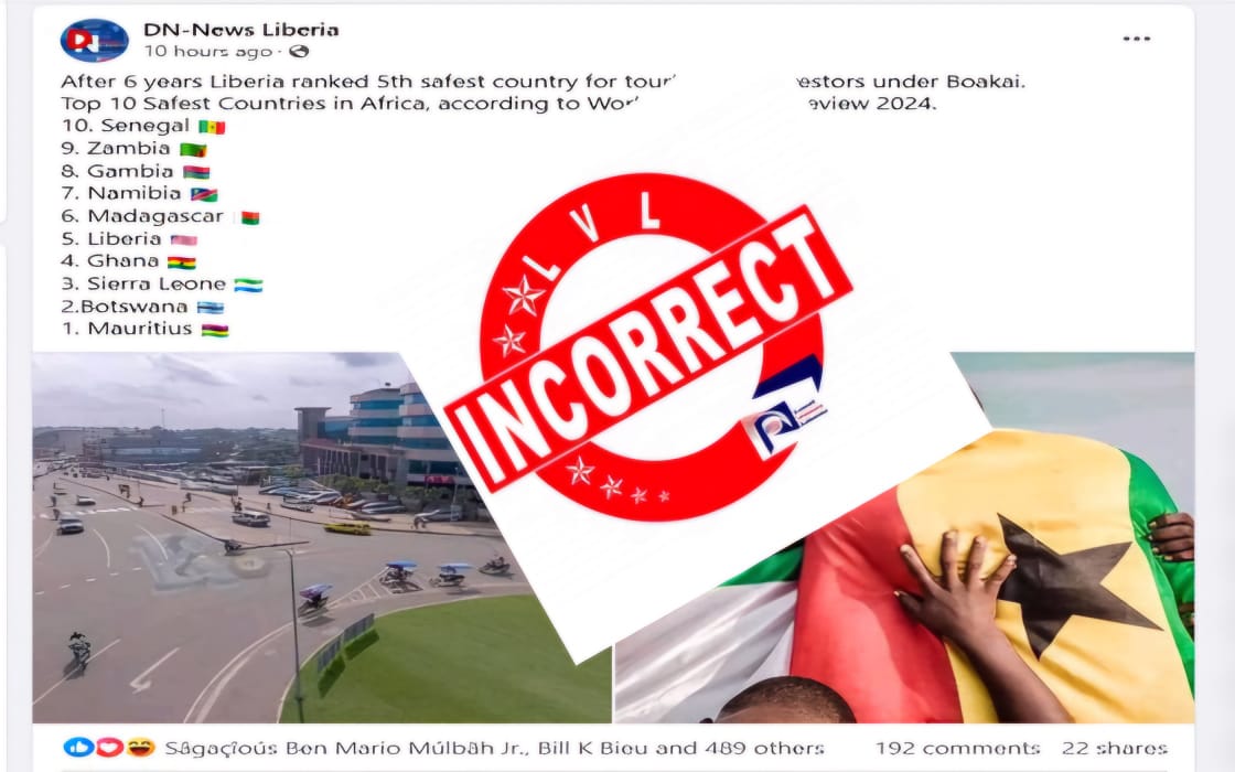 Contrary to DN-News Liberia’s claim, the World Population Review 2024 ranks Liberia as the 10th safest country in Africa, not the 5th.