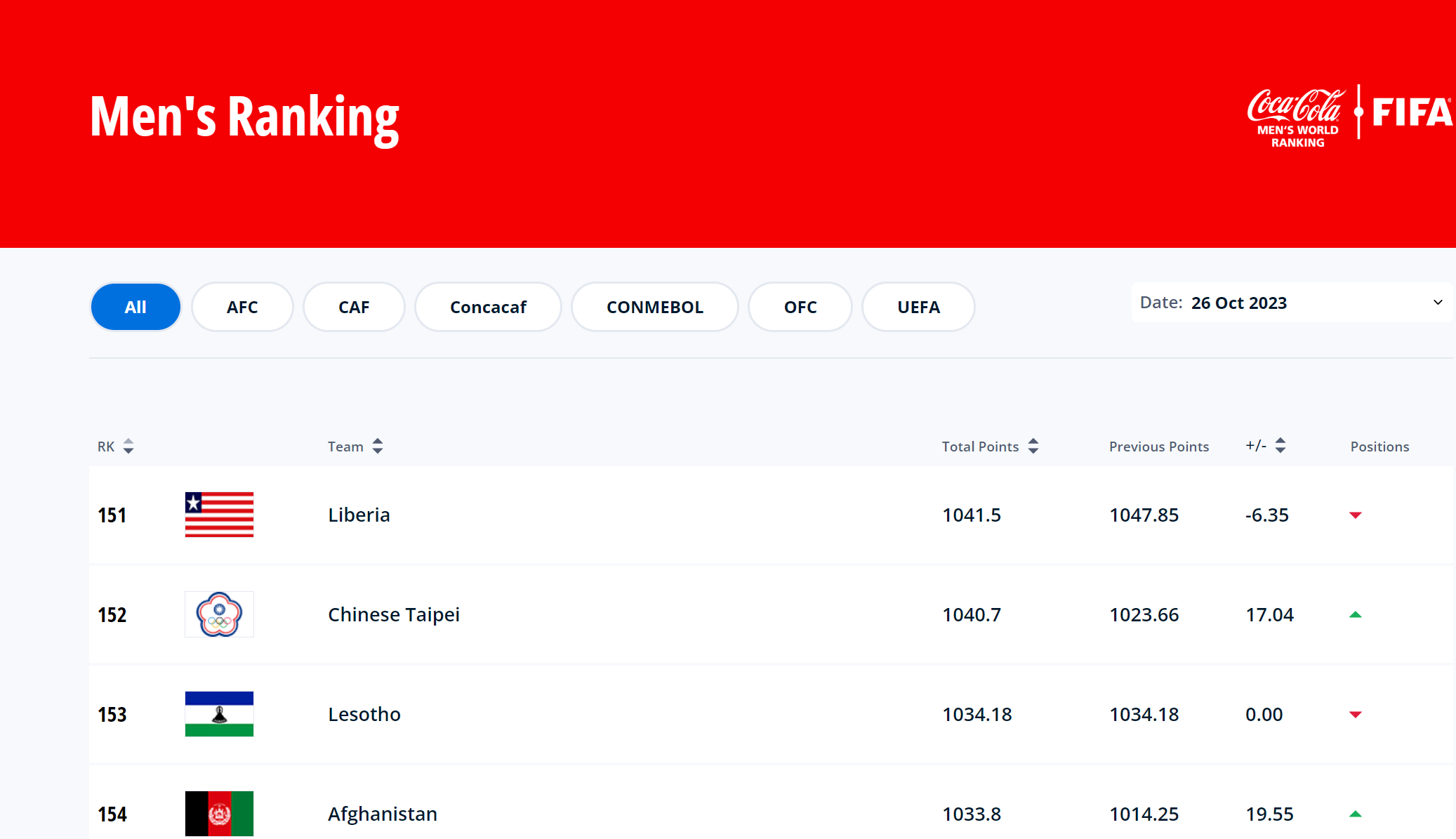 We also obtained the October 26, 2023, FIFA ranking and reviewed the list. We found that FIFA has ranked Liberia 151 out of 205 countries.