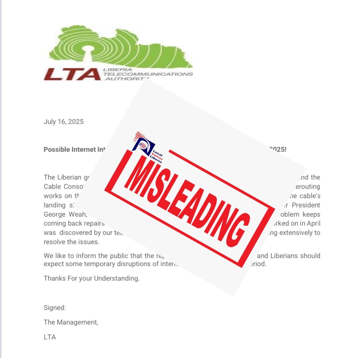 On the evening of July 16, a press release surfaced online claiming that there could be possible internet interruptions in Liberia due to technical issues. The release claimed to be from the Liberia Telecommunications Authority (LTA).