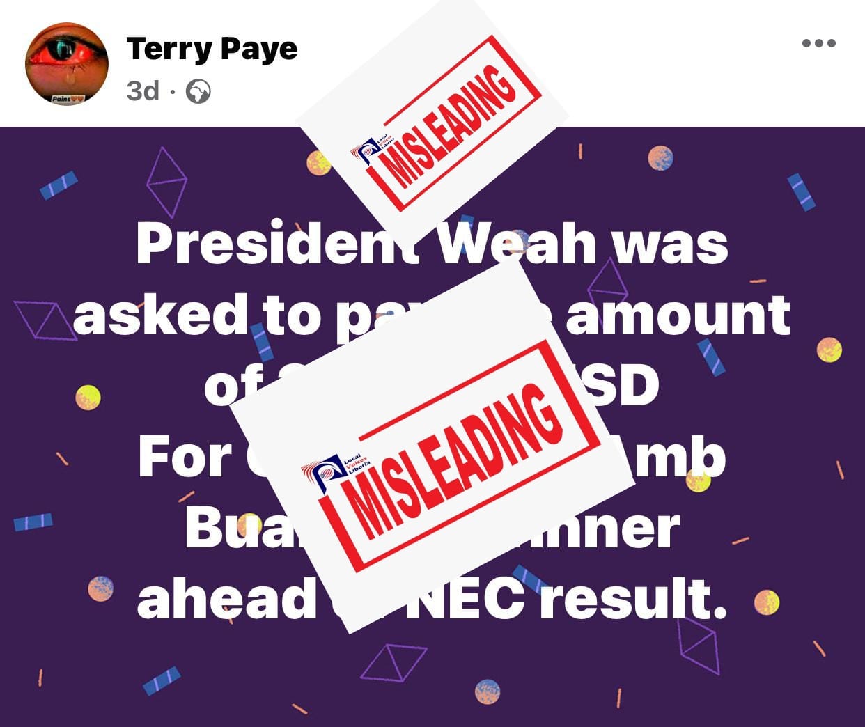 Another Facebook user identified as Terry Paye also claimed that President Weah was asked by the Commission to pay US$2 million for conceding defeat.