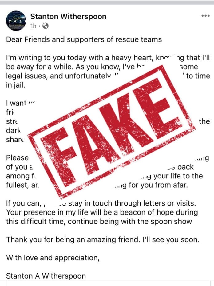 Summary: A viral post circulating on Facebook purporting to be made by Stanton Witherspoon announcing his imprisonment is fake and misleading.