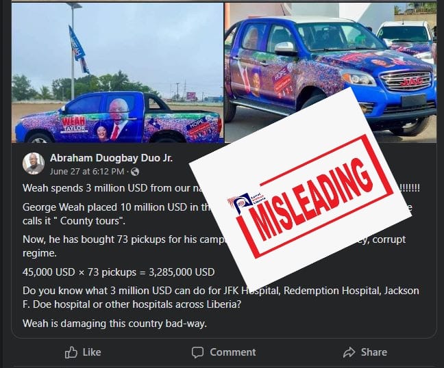 On June 27, 2023, a supporter of the opposition Unity Party, Abraham Duogbay Duo Jr. took to Facebook, claiming that “President George Weah placed US$10 million in the 2023 National budget for his campaign, [but] he calls it ‘çounty tours’.”