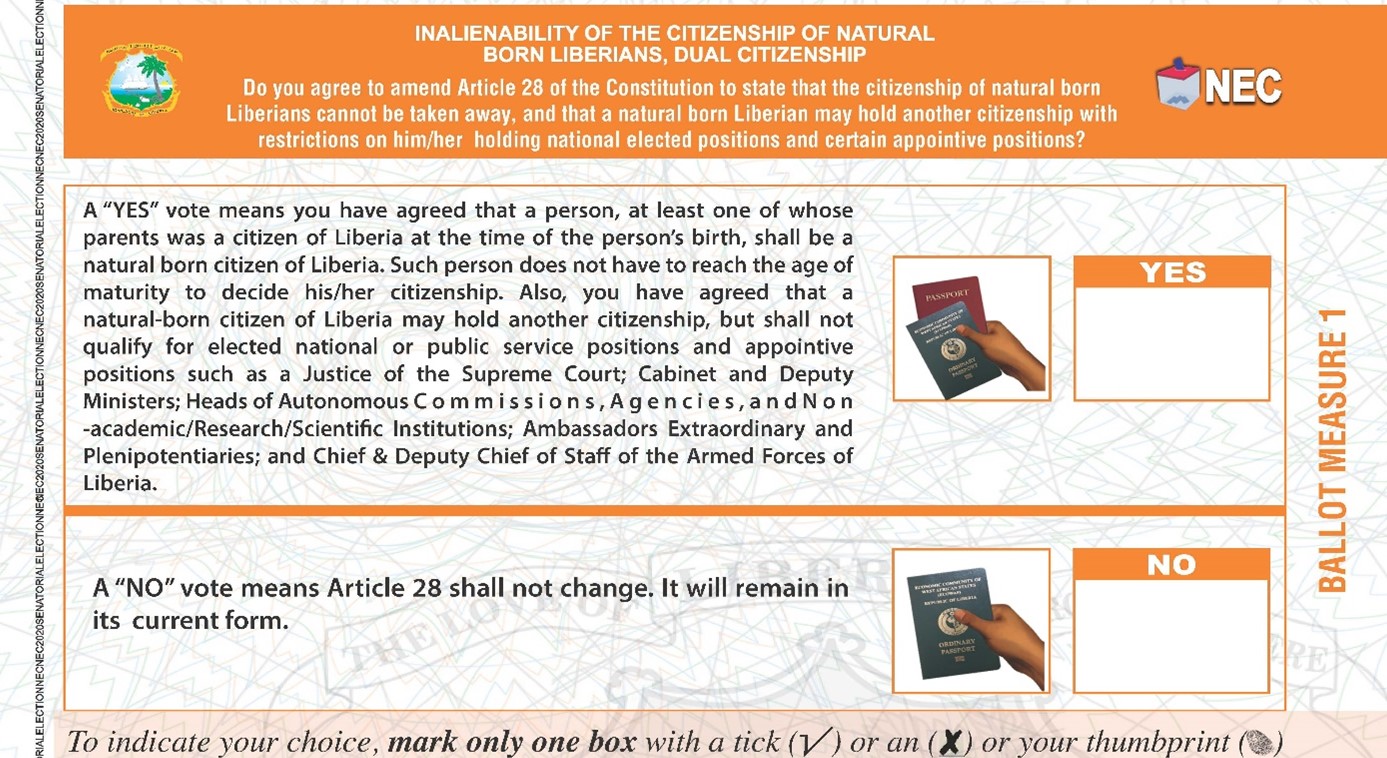 A “YES” vote means you have agreed that a person, at least one of whose parents was a citizen of Liberia at the time of the person’s birth, shall be a natural born citizen of Liberia. Such person does not have to reach the age of maturity to decide his/her citizenship. Also, you have agreed that a natural-born citizen of Liberia may hold another citizenship, but shall not qualify for elected national or public service positions and appointive positions such as a Justice of the Supreme Court; Cabinet and Deputy Ministers; Heads of Autonomous Commissions, Agencies, and non-academic/Research/Scientific Institutions; Ambassadors Extraordinary and Plenipotentiaries; and Chief & Deputy Chief of Staff of the Armed Forces of Liberia.
