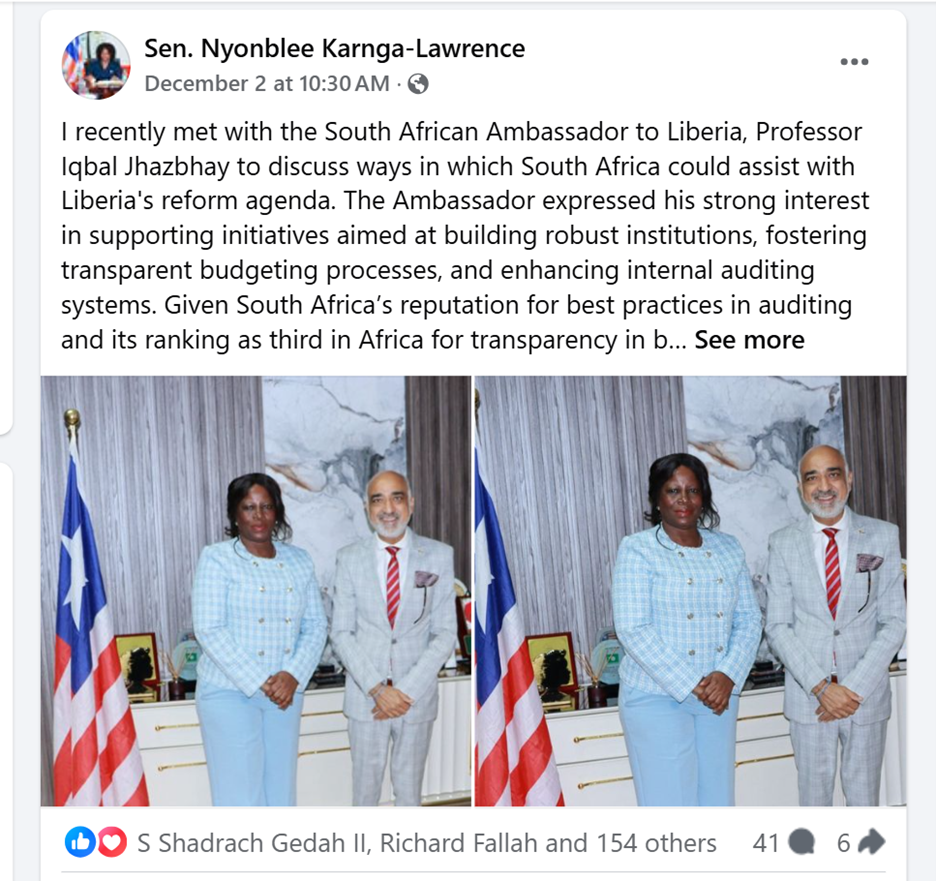 - The Grand Bassa County Senator made the post after meeting South Africa’s ambassador to Liberia to discussion support for Liberia