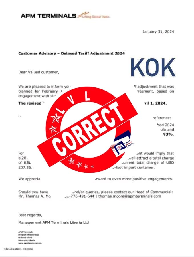 Social media on last week got flooded with a letter that is claimed to have been released  by APM Terminals Liberia dated January 31, 2024 to its customers informing them of additional 4.93% tariff increment for clearing containers at the port.