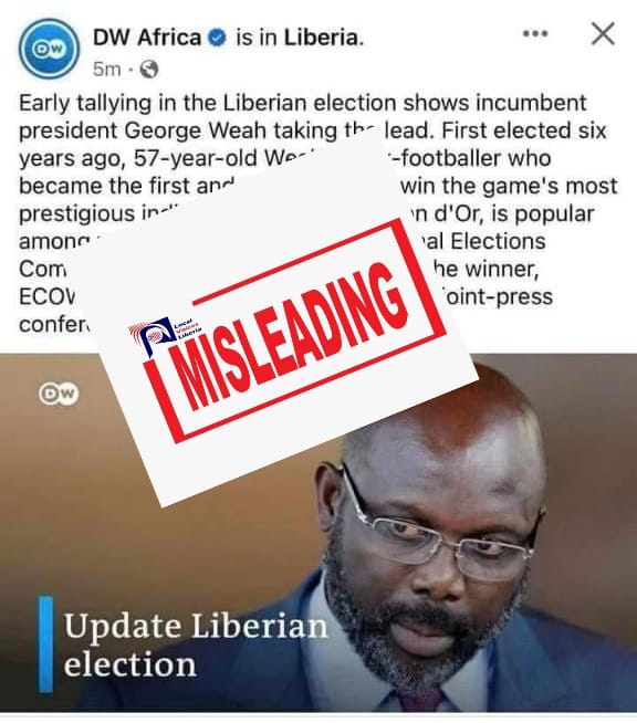 On Thursday, October 12, DW Africa, an auxiliary of the German news organization Deutsche Welle, posted on to its Facebook page claiming that incumbent President George Weah was leading the election due to preliminary results announced by the National Elections Commission.