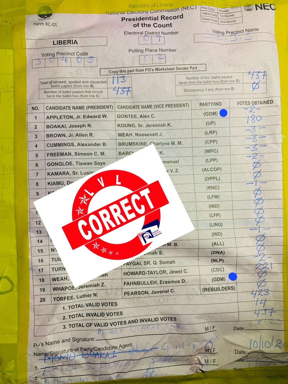 On these presidential record of the count sheets also known by many as the tally sheet, Candidate Appleton, who is at #1 on the ballot paper represents Grassroots Development Movement or “GDM”, But also Dr. Jeremiah Whapoe has “GDM” in front of his name instead of “VOLT.”